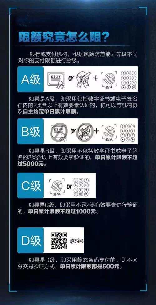 对于使用动态条码(如手机上实时生成的条码)进行支付的,风险防范能力根据交易验证方式不同分为A、B、C三级,同一客户单日累计交易限额分别为自主约定、5000元、1000元。